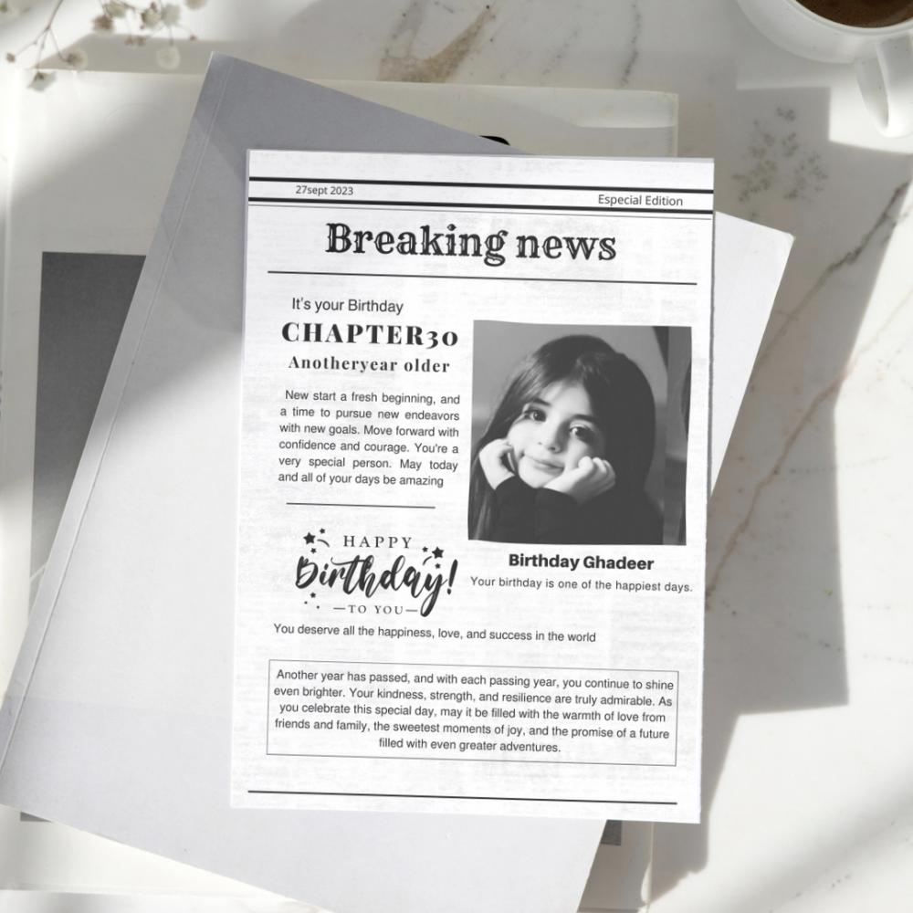 جريدة يوم الميلاد فكرة مميزة للاحتفال بيوم ميلادك أو ميلاد شخص عزيز عليك ،يتم ارسال التصميم Pdf على رقم الواتساب المسجل بالطلب ، اصنع ذكرى جميلة ومميزة للشخص الذي يحتفل بيوم ميلاده، وعبرعن محبتك وتقديرك له.
