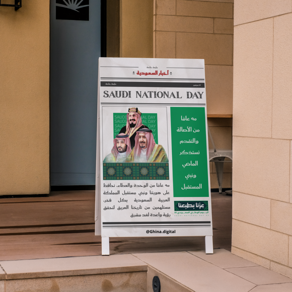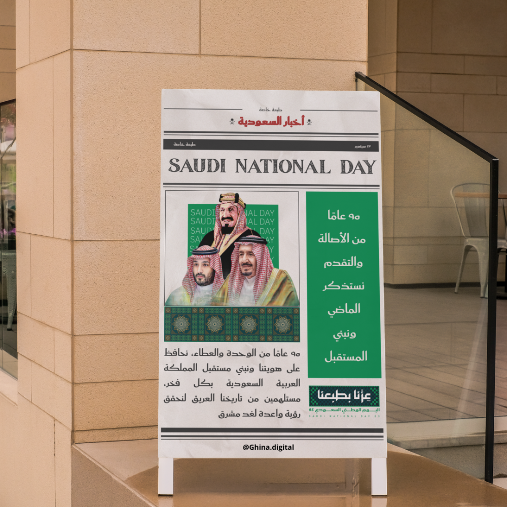 تصميم احترافي لستاند اليوم الوطني السعودي الـ95 بأسلوب مستوحى من شكل الجريدة،